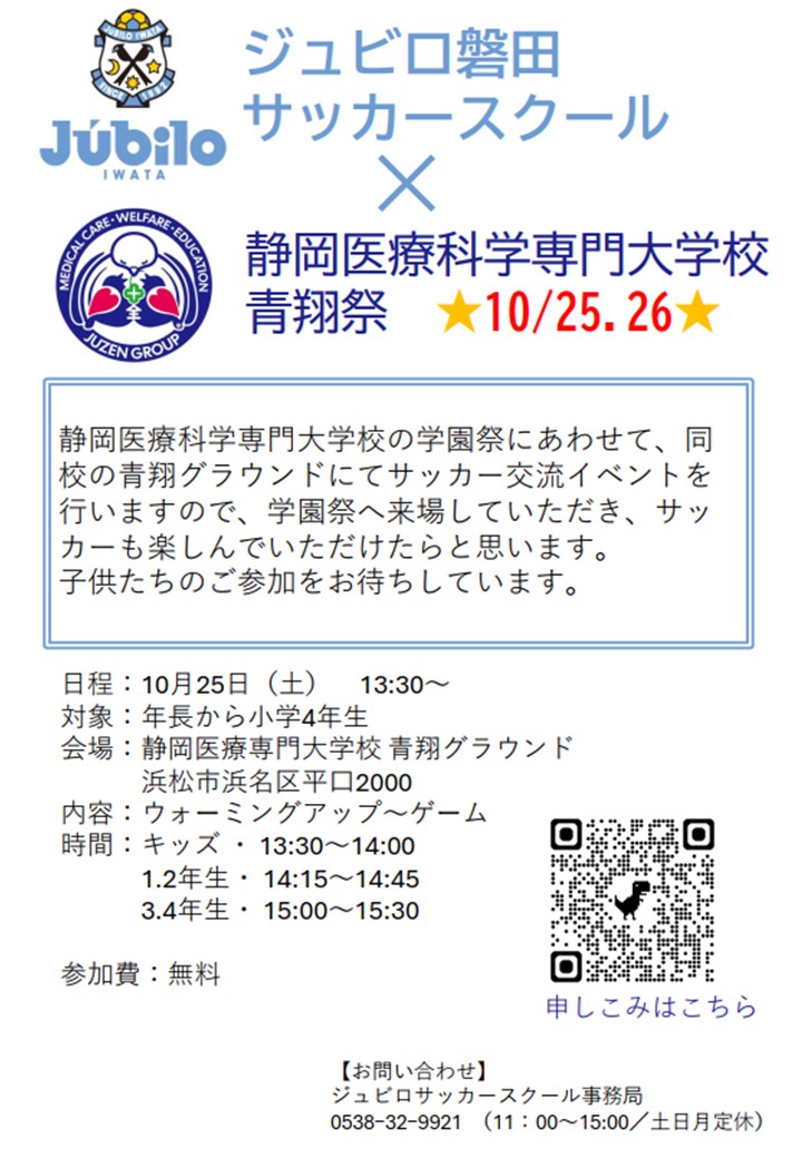 2025年10月06日お知らせ サッカー交流イベントin静岡医療科学専門大学校 静岡医療科学専門大学校の学園祭にあわせて、サッカーの交流イベントをおこないます。 日時:10月25日(土)13:30~ 場所:静岡医療科学専門大学校青翔グランド 対象:小学4年生までのお子様 参加費:無料