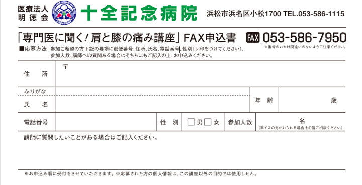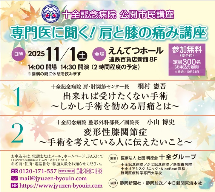 2025年09月29日お知らせ 十全記念病院 公開市民講座2025 令和7年11月1日(土)に十全グループの十全記念病院が公開市民講座を開催します。 当日は同院の整形外科Dr2名が講座を行います。 膝や肩、肘の痛みでお悩みの方はぜひご参加ください。
