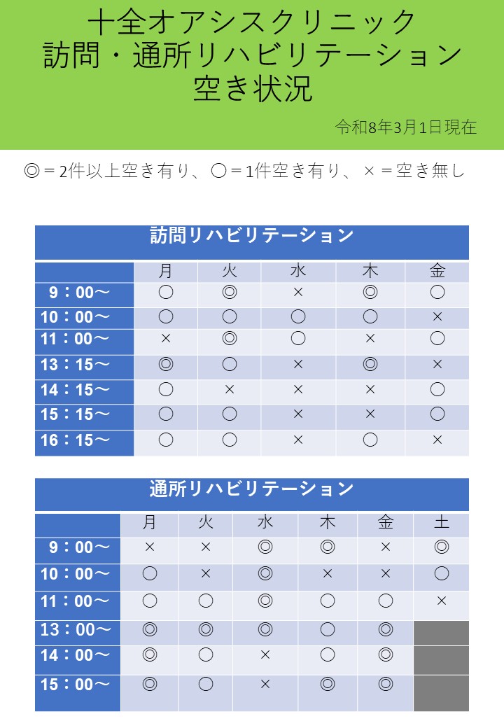 2026年03月01日お知らせ 3月訪問リハビリ・通所リハビリ 空き状況 訪問リハビリテーション・通所リハビリテーションの空き情報をお知らせいたします。 ご希望の方、またはご不明な点等ございましたら担当までご連絡ください。 お問合せ先 :十全オアシスクリニック リハビリテーションセンター お問合せ番号:053-582-8115(9:00-16:30) 訪問リハ担当:土屋・大草 通所リハ担当:伊藤・大草